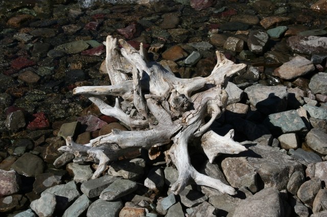 Matt and Kay were kind enough to enhance the Two Medicine sign at that entrance. The lake was really pretty, though the day was very windy, which you can see from the waves. And I couldn’t resist an intriguing piece of driftwood.