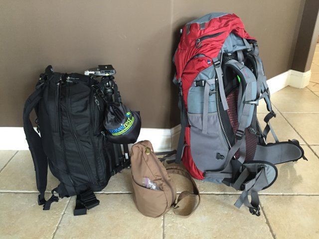 Everything I’m taking is stuffed into two backpacks. The tall one (red top) is for “me stuff.” That’s the one I’m checking. The black one is all camera and computer equipment. Probably too much, but if I’m going half-way around the world, I want to be prepared! I hope I can haul it all…the stuff’s heavy!